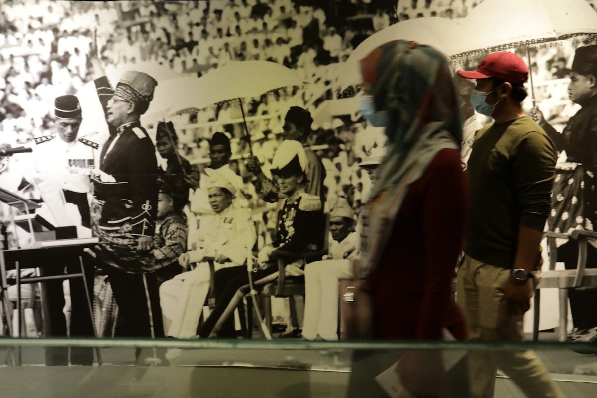 Pengunjung Kuala Lumpur memerhati foto Perdana Menteri pertama Tunku Abdul Rahman Putra Alhaj melaungkan Merdeka dalam Pameran Kemerdekaan Ke-63 di Muzium Negara pada 22 Ogos 2020.