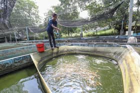 Pekerja Muhammad Izuam Zakaria, 27, memberi benih ikan talapia makan ketika tinjauan bancian di Aquaculture Resources Centre (ARC) benih ikan keli dan talapia di Kampung Kubu Gajah, Sungai Buloh pada 28 Julai 2024.