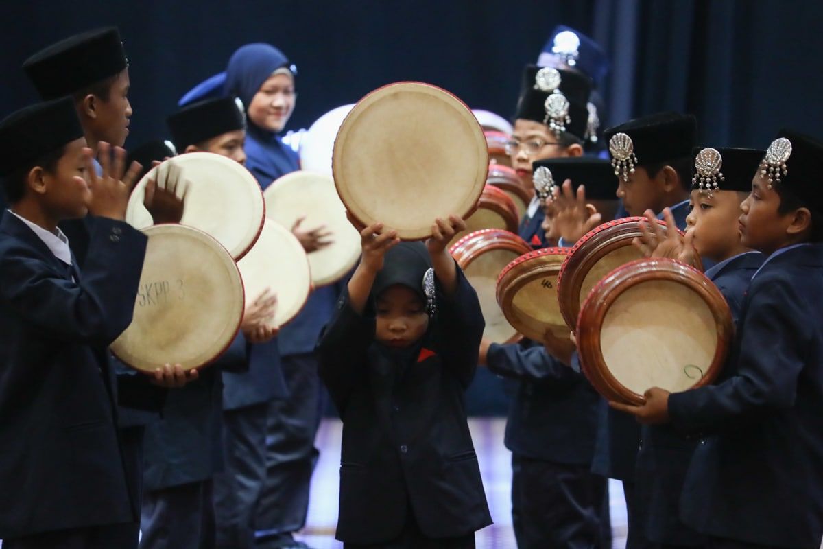 Murid Sekolah Kebangsaan Permatang Pasir, Kuala Langat membuat persembahan kompang ketika majlis penutupan rasmi Pertandingan Debat Darul Ehsan Piala Speaker Dewan Negeri Selangor (DNS) di Dewan Jubli Perak Bangunan Sultan Abdul Aziz, Shah Alam pada 25 Jualai 2024.