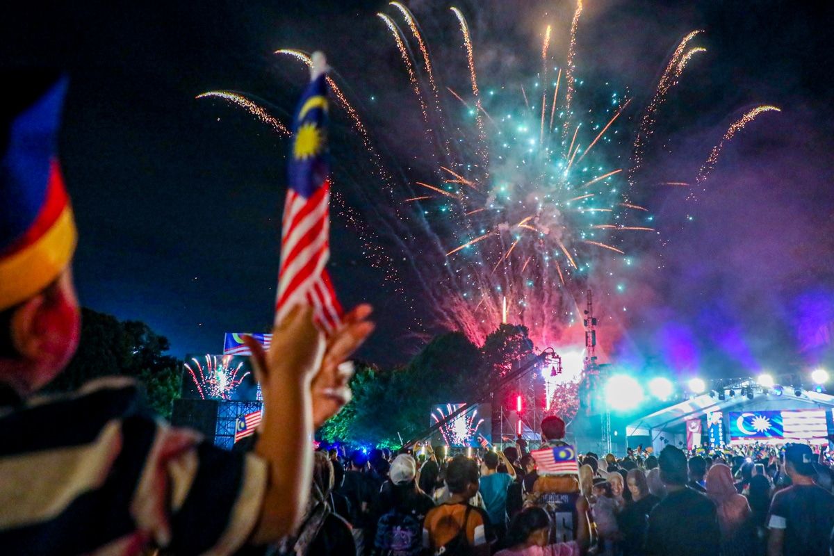 Orang ramai menyaksikan pertunjukkan bunga api sempena Hari Kebangsaan ke-67 peringkat negeri di Dataran Kemerdekaan Shah Alam pada 30 Ogos 2024.