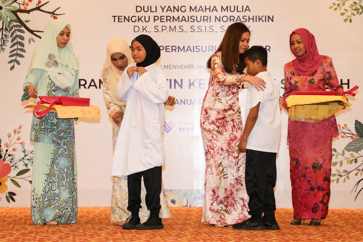DYMM Tengku Permaisuri Norashikin (tiga dari kiri) berkenan memakaikan seragam kepada pelajar dalam Program Prihatin Kembali Ke Sekolah di Wisma MBSA, Shah Alam pada 19 Januari 2020.