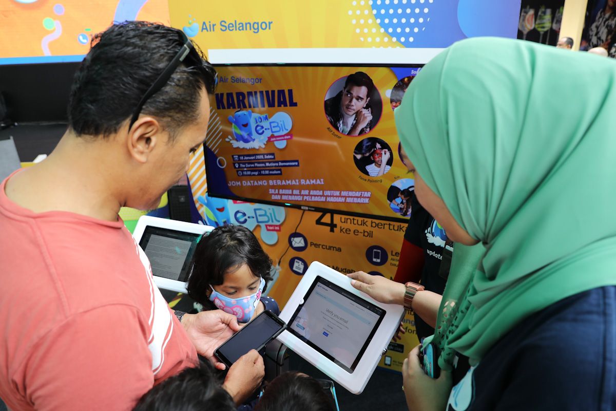 Petugas memberikan penerangan kepada orang ramai mengenai aplikasi E-Bil ketika Karnival Jom E-Bil Air Selangor berlangsung di The Curve, Damansara pada 18 Januari 2020.