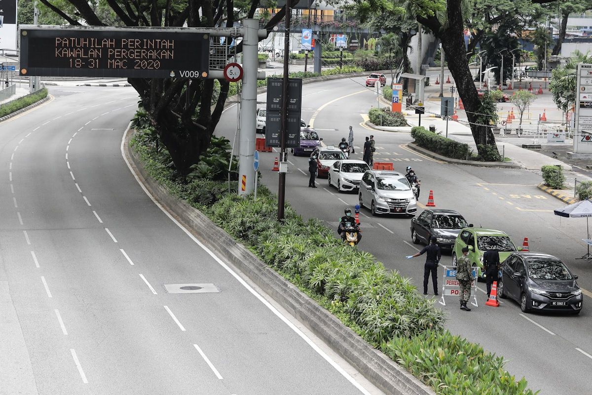 Anggota polis membuat sekatan jalan raya di Jalan Ampang pada 21 Mac 2020 susulan pelaksanaan Perintah Kawalan Pergerakan bagi mengawal penularan Covid-19.
