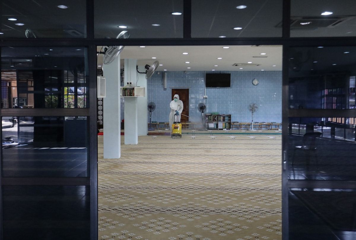 Kakitangan dari syarikat swasta menjalankan proses penyahkuman atau disinfeksi di seluruh ruang solat Madrasah Al-Khairiah, Taman Salak Jaya, Kuala Lumpur pada 24 Mac 2020 susulan penularan COVID-19.