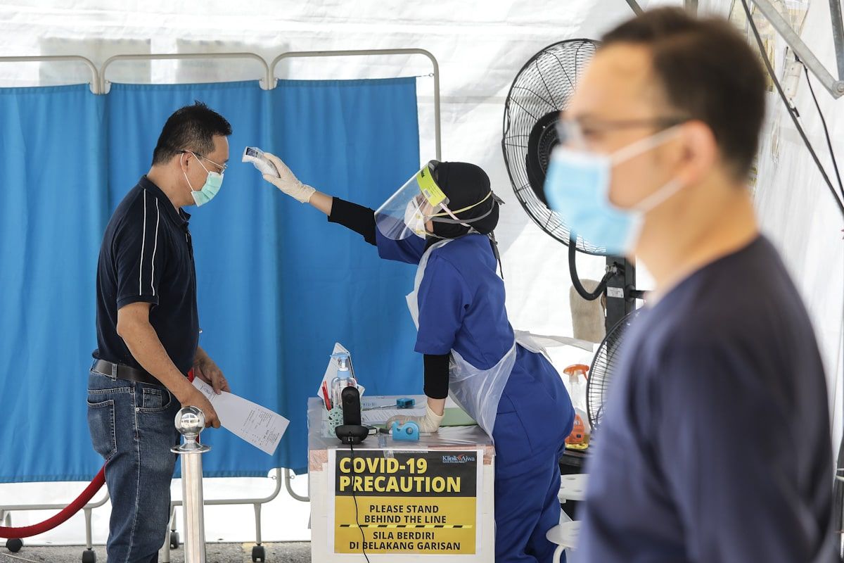 Pembantu perubatan memeriksa suhu badan orang awam sebelum mendapatkan rawatan di Klinik Ajwa, Seksyen 7, Shah Alam pada 27 Mac 2020 sebagai langkah mencegah penularan Covid-19.