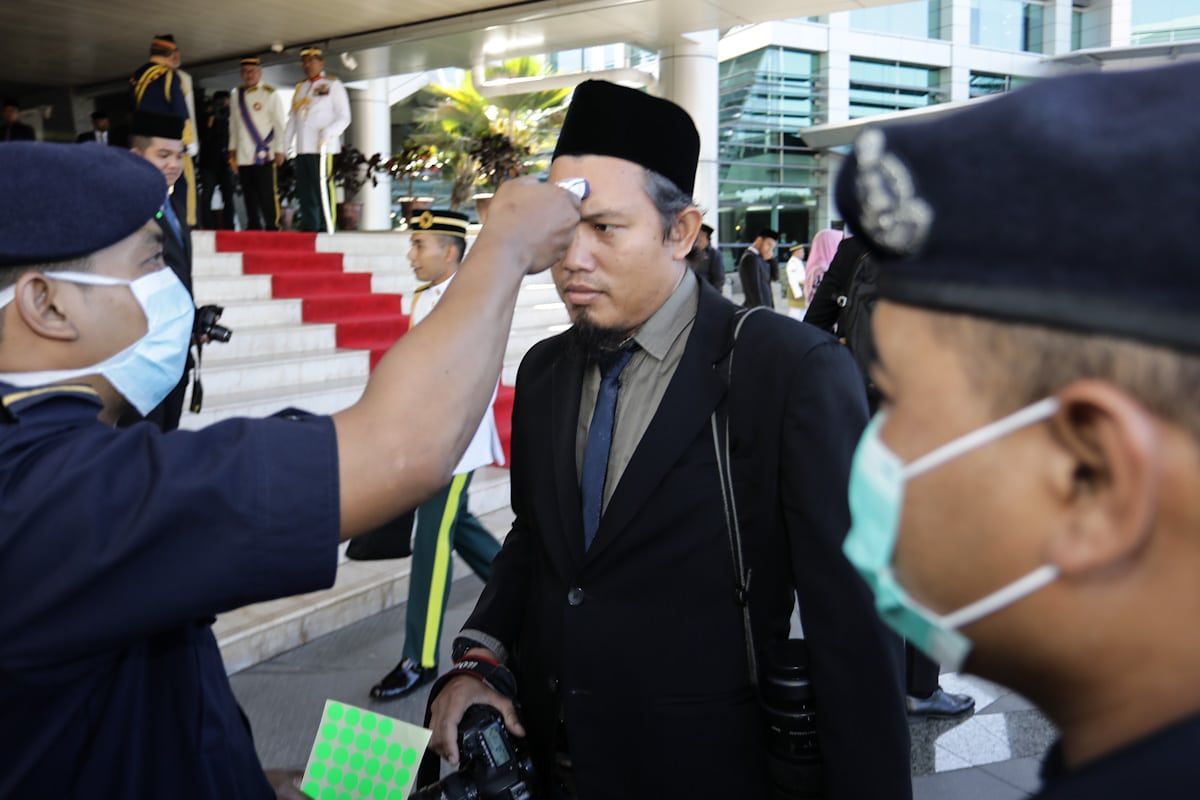 Pemeriksaan suhu badan petugas media sebelum memasuki dewan bagi Istiadat Pembukaan Persidangan Penggal ketiga Dewan Negeri Selangor di Dewan Negeri Selangor, Shah Alam pada 16 Mac 2020.