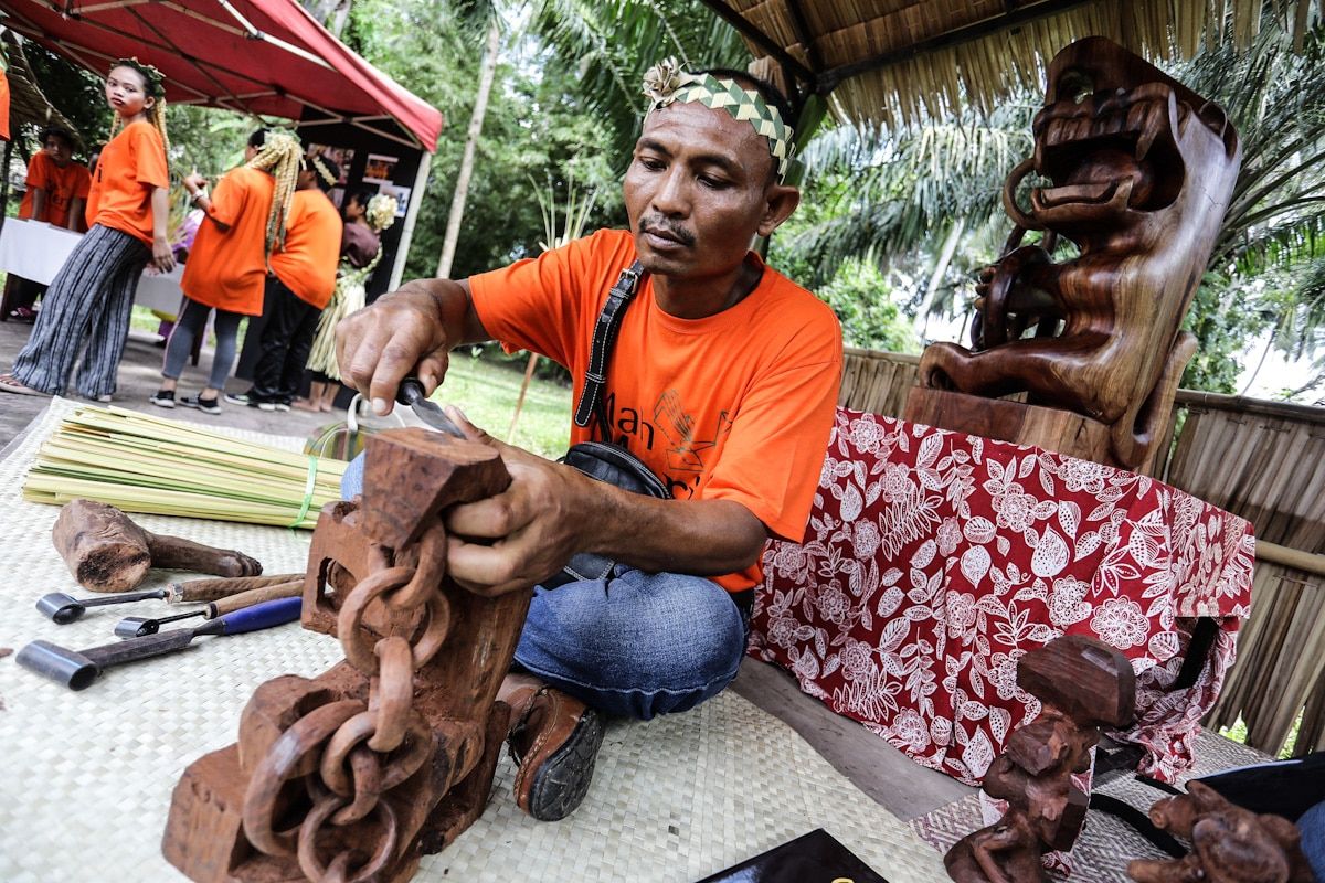 Husin Tion sedang membuat ukiran Moyang Harimau Berantai Mah Meri sempena Program Perjumpaan DYMM Sultan Selangor dengan Masyarakat Orang Asli Negeri Selangor di Pusat Kraf Orang Asli, Kampung Sungai Bumbun, Pulau Carey, Kuala Langat.