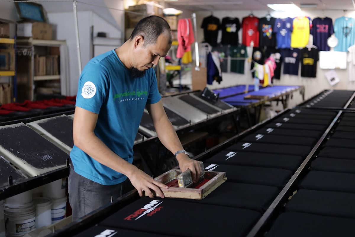 Pekerja Hyper Colour Resources, Kota Raja sedang mencetak baju ketika lawatan program Kembara Sukses Hijrah Selangor.