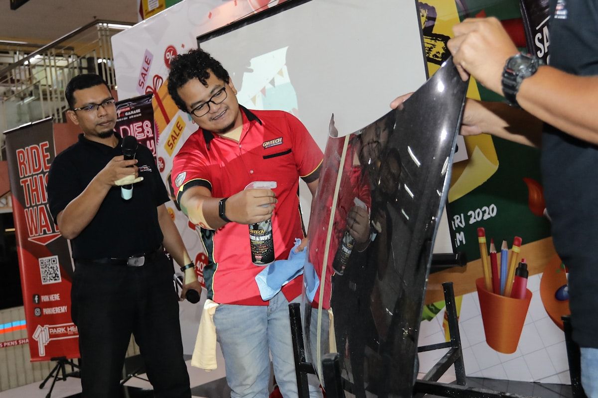 Eksekutif pemasaran digital, Wan Muqaram menunjukan demo produk penyembur dan pengelap sempena Majlis Pelancaran Park Here Detailing Garage Ke Arah Hub Automobil Di Selangor di Kompleks PKNS, Shah Alam pada 4 Januari 2020.