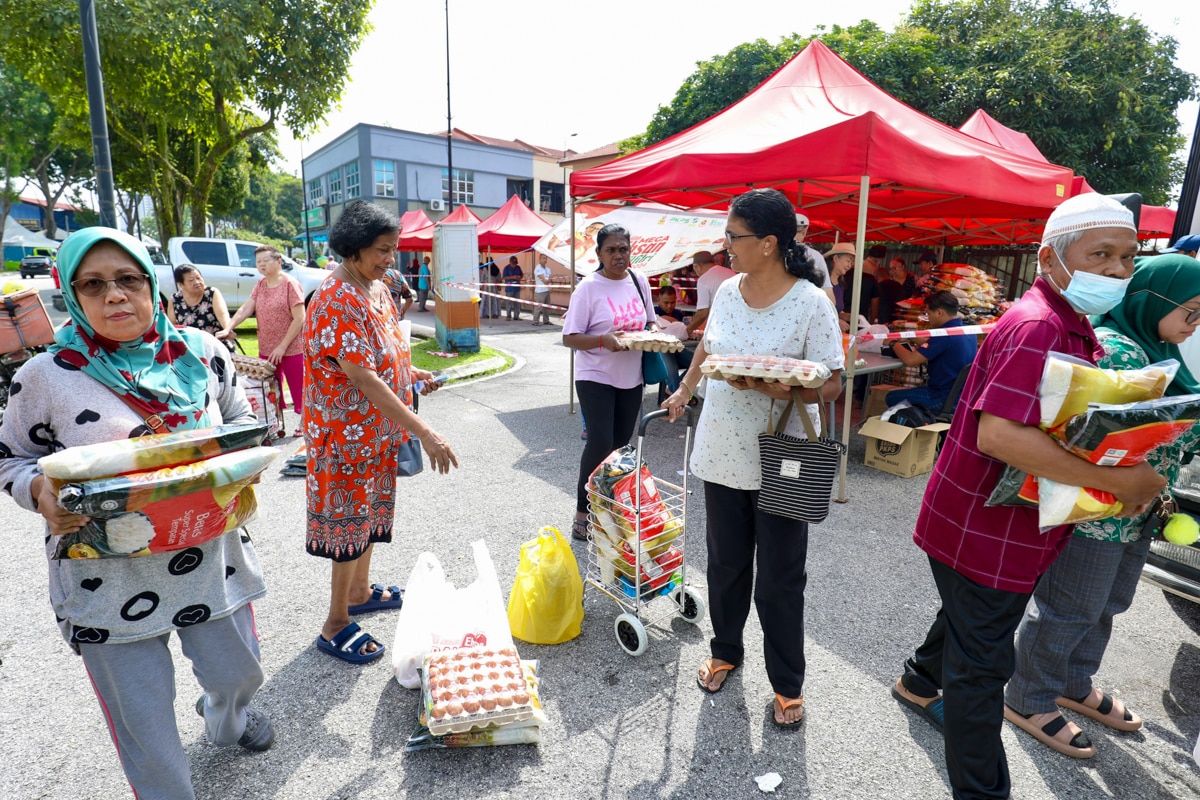 Orang ramai membeli barangan keperluan asas yang dijual murah berbanding harga pasaran ketika program Jualan Ehsan Rahmah DUN Pandan Indah di Dataran Pandan Prima, Ampang Jaya pada 14 Mei 2024.