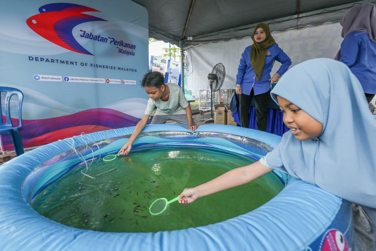 Kanak-kanak gembira menangkap ikan gapi di gerai pameran Jabatan Perikanan Malaysia ketika majlis Perasmian AgroGreen dan Hari Rendah Karbon di Dataran Pantai Batu Laut, Kuala Langat pada 13 Julai 2024.