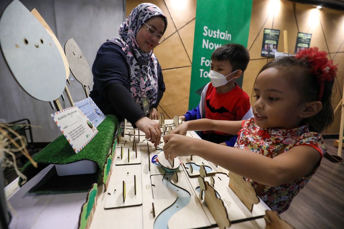 Pempamer Program Executive from Eco Lestari Strategy Nasuha Jebat menunjukkan model sungai program adiwira sungai kepada kanak-kanak ketika majlis pelancaran Buku: Malapetaka Iklim / Memahami Fenomena Pemanasan Dunia dan Buku Komik Ke Mana Hilangnya Katak Hijau di PJ Live Arts, Petaling Jaya pada 21 Februari 2024.