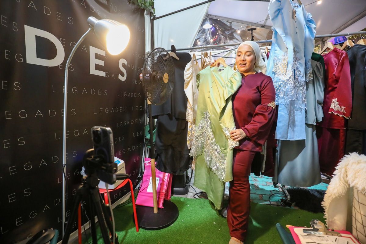 Aida Idris membuat siaran langsung Tik-Tok mempromosikan jualan pelbagai pakaian raya daripada Legades ketika tinjauan di Bazar Raya Shah Alam City Centre, Shah Alam pada 27 Mac 2024.