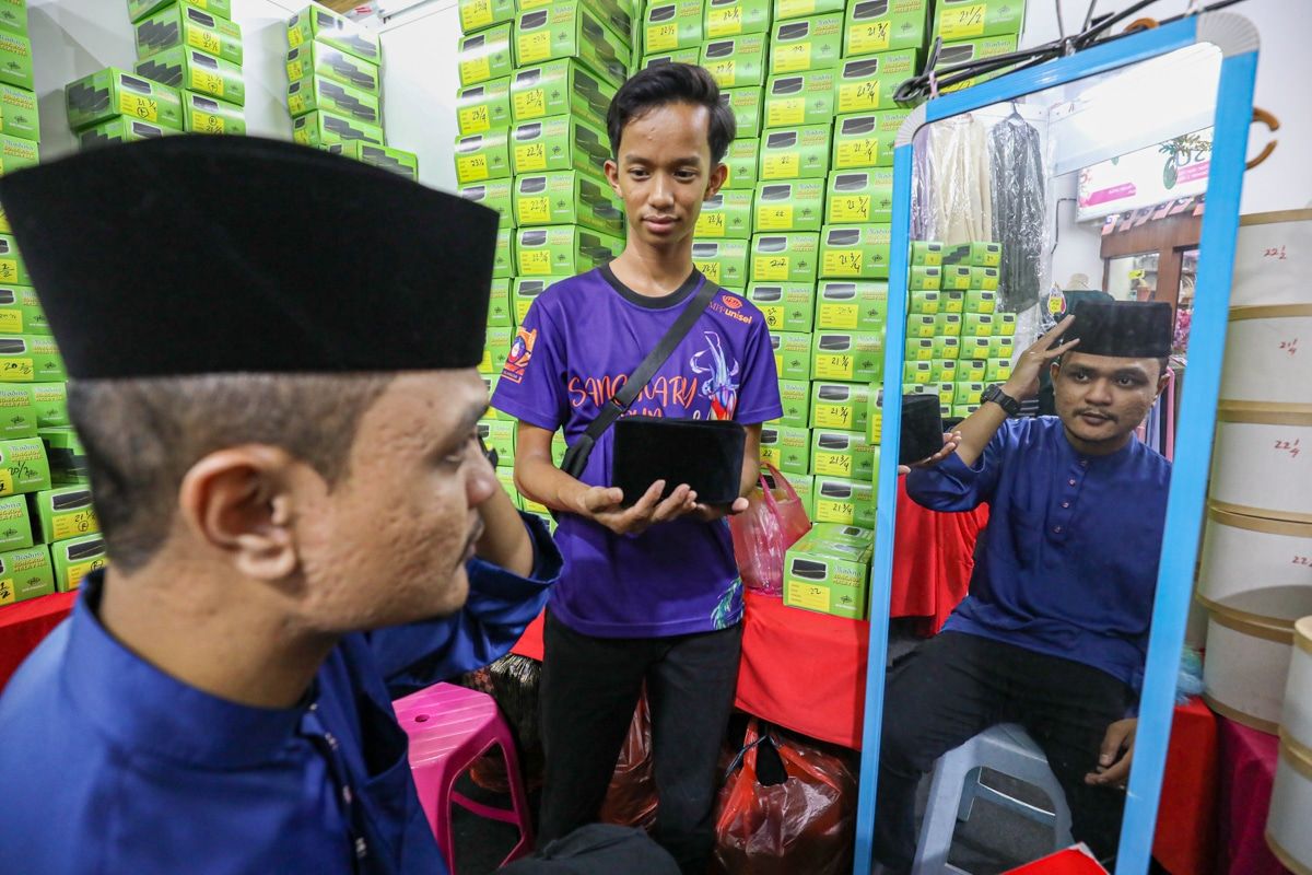 Azizul Azhim, 28, mencuba songkok di gerai Nadir Enterprise ketika tinjauan SelangorKini di Bazar Raya Kompleks PKNS, Shah Alam pada 27 Mac 2024.