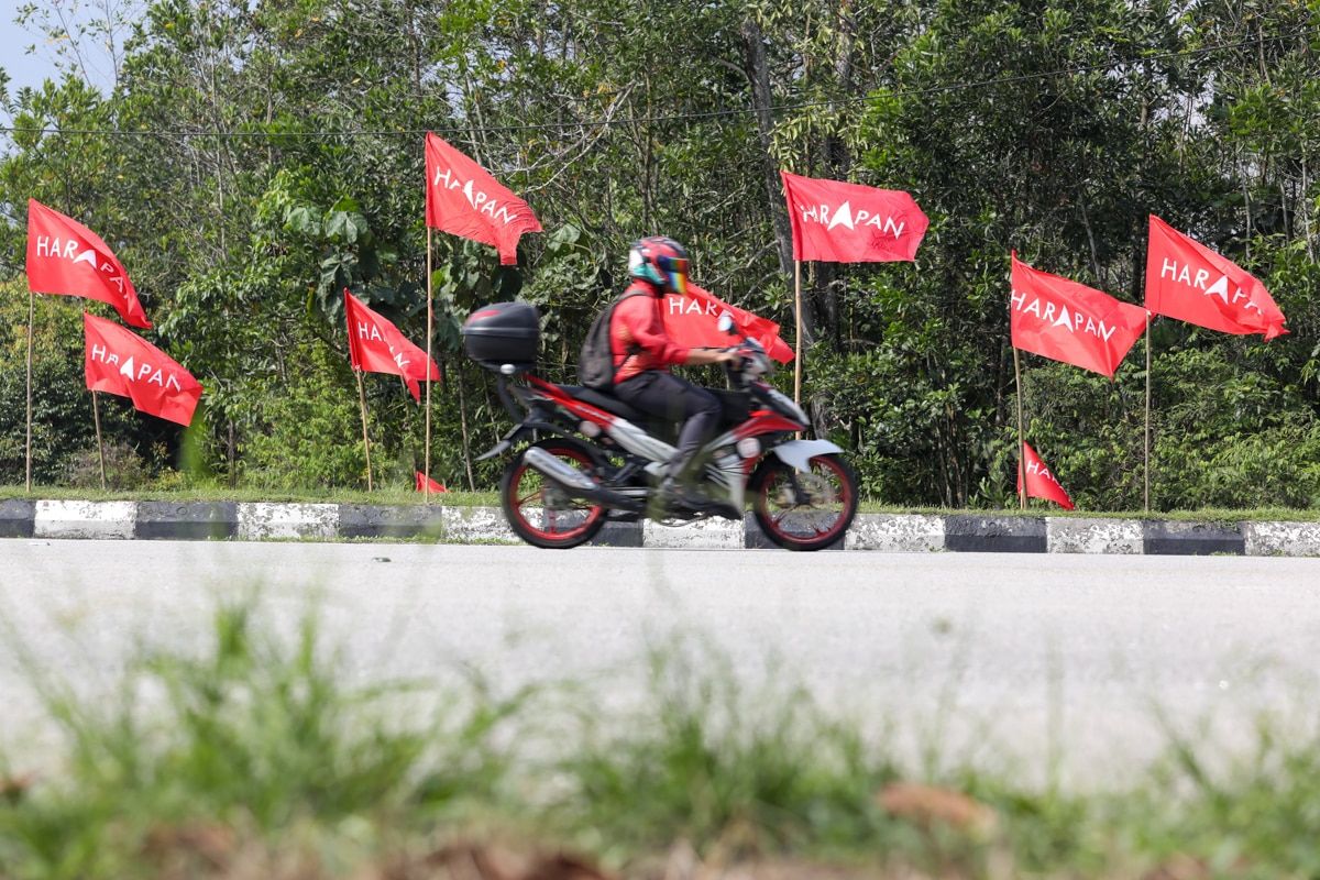 Seorang penunggang motosikal melintas bahu jalan yang dihiasi dengan bendera Pakatan Harapan ketika tinjauan di sekitar Kerling, Hulu Selangor pada 29 April 2024.