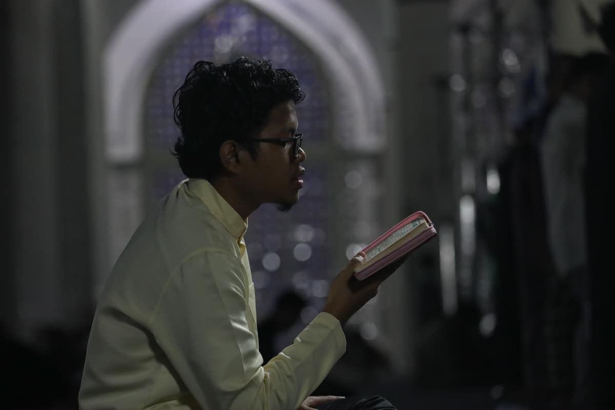Jemaah membaca al-quran ketika program qiamullail perdana, sahur dan solat subuh berjemaah di Masjid Sultan Salahuddin Abdul Aziz Shah, Shah Alam pada 7 April 2024.