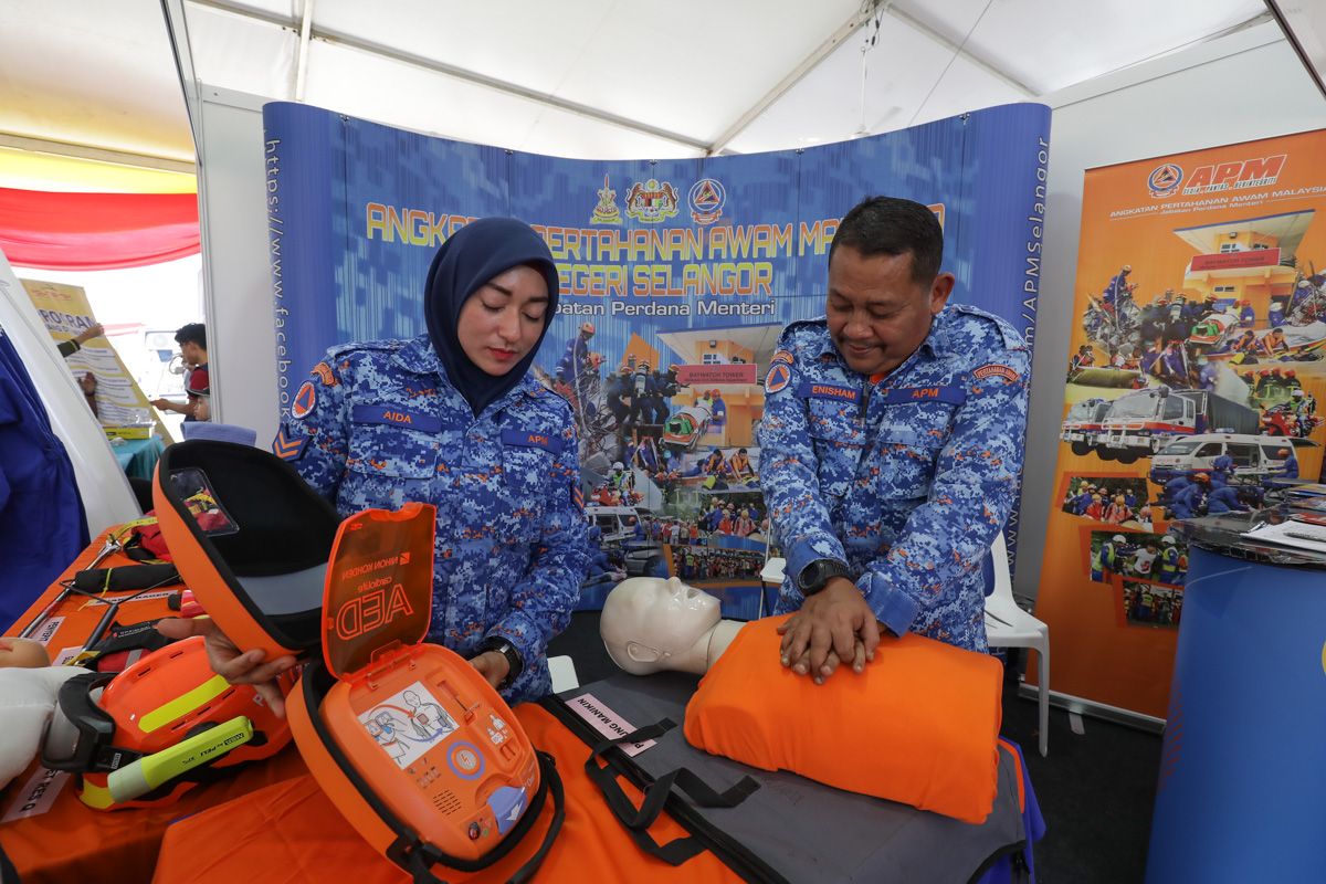 Anggota Angkatan Pertahanan Awam Negeri Selangor menunjukkan langkah dan peralatan yang digunakan untuk pertolongan cemas di reruai pameran ketika program Jelajah Kita Selangor Penyayang (JKSP) daerah Sabak Bernam di Dataran Bagan Terap, Sabak Bernam pada 19 Mac 2023.
