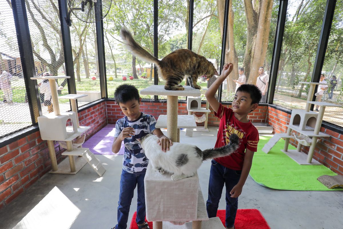 Adik-beradik kembar, Adam Shafiy Mohd Shafizol, 8, (kanan) bersama Ammar Sufi Mohd Shafizol, 8, bermain kucing jalanan di Taman Kucing Cyberjaya, Sepang pada pada 18 Mac 2023.
