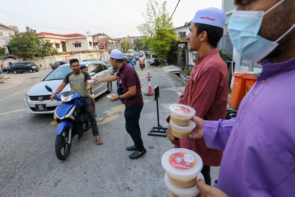 Ahli Jawatankuasa surau mengagihkan bubur lambuk kepada penduduk secara pandu lalu ketika majlis doa selamat dan berbuka puasa di Surau Al-Karimiah, Gombak pada 12 April 2023.
