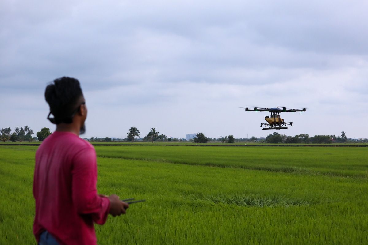 Seorang petani mengendalikan dron bagi memudahkan kerja semburan racun tanaman padi ketika tinjauan Media Selangor di Kampung Sungai Leman, Sabak Bernam pada 2 April 2023.