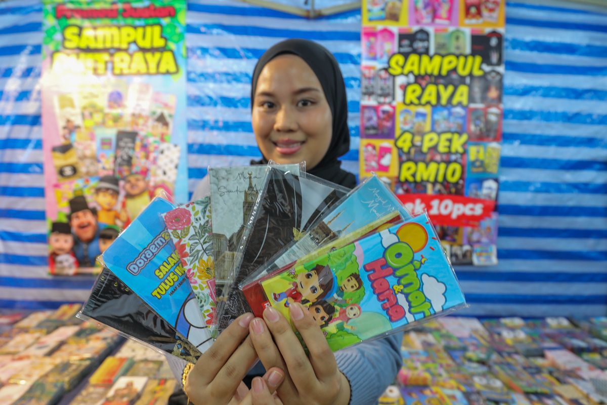 Peniaga, Nurul Fadilla Bukhari, 25, menunjukkan pelbagai jenis sampul duit raya yang dijual bagi persiapan menyambut hari raya Aidilfitri di bazar raya Jalan Taiping, Klang pada 6 April 2023.