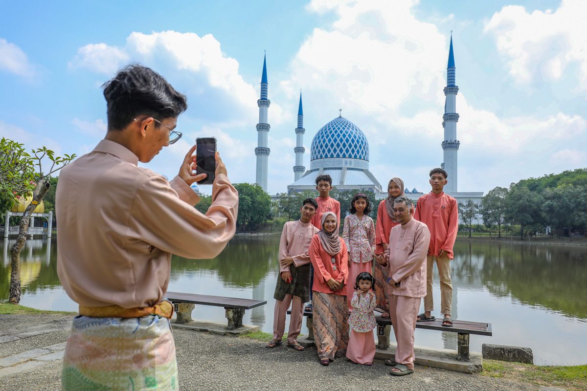 Orang ramai berswafoto bersama keluarga ketika tinjauan Media Selangor pada Hari Raya Aidilfitri di Taman Tasik Shah Alam, Shah Alam pada 22 April 2023.