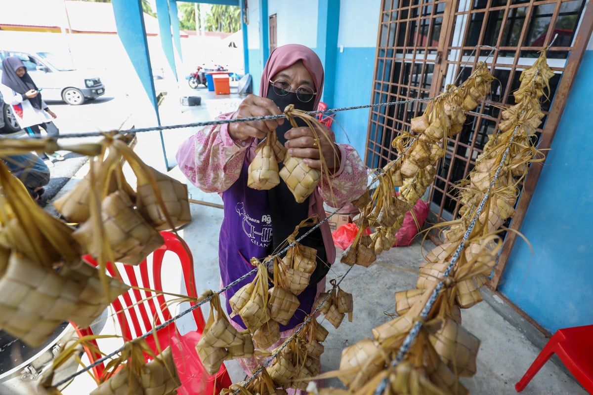 Azizah Samin, 59, menggantung ketupat yang telah di masak ketika rewang sekampung sempena Jelajah Kita Selangor Aidilfitri daerah Sabak Bernam di Dataran Tanah Lesen Parit Baru, Sabak Bernam pada 12 Mei 2023.