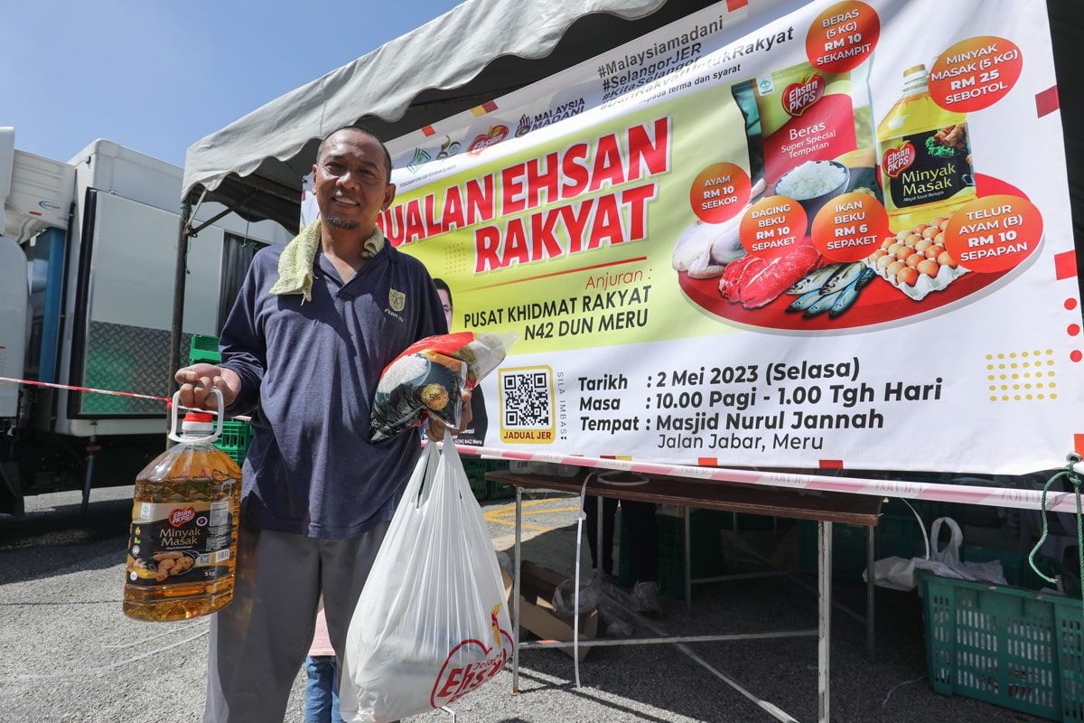 Penduduk Lotfi Saari, 48, menunjukkan barangan yang dibeli ketika program Jelajah Ehsan Rakyat di Masjid Nurul Jannah, Klang pada 2 Mei 2023.