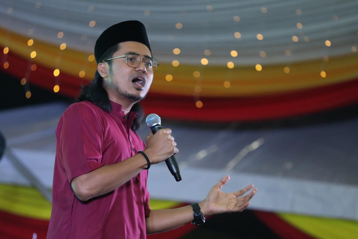 Penyanyi Lan Solo atau Mohd Razlan Mohamed Yusof menbuat persembahan nyanyian ketika majlis rumah terbuka Jelajah Kita Selangor Aidilfitri daerah Sabak Bernam di Dataran Tanah Lesen Parit Baru, Sabak Bernam pada 12 Mei 2023.