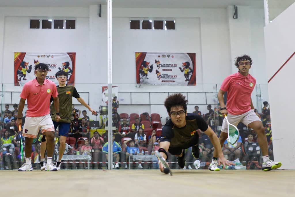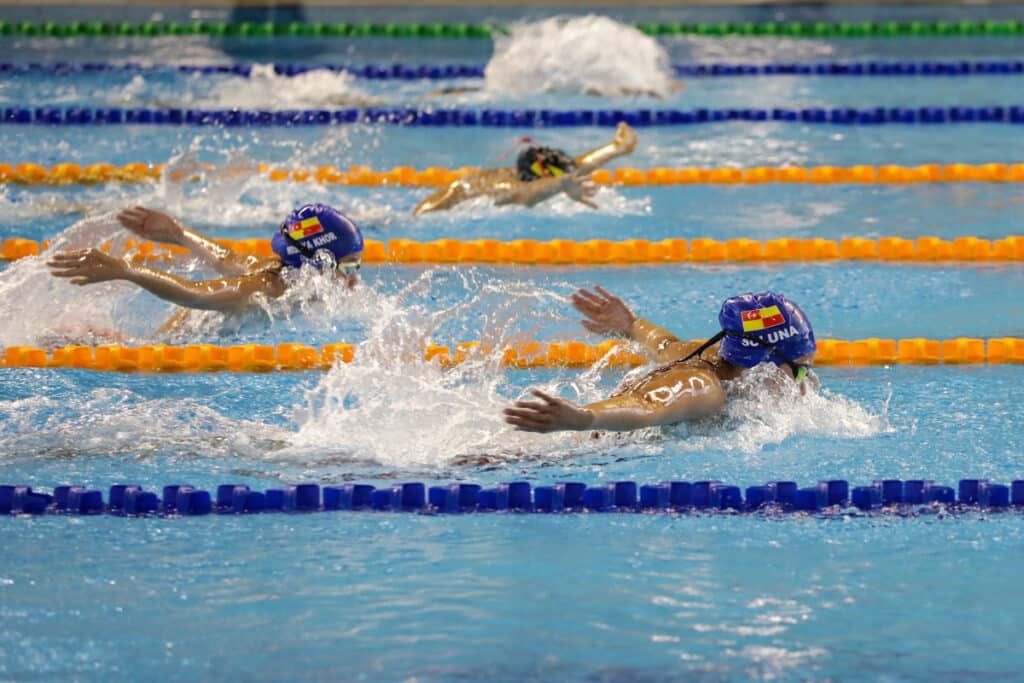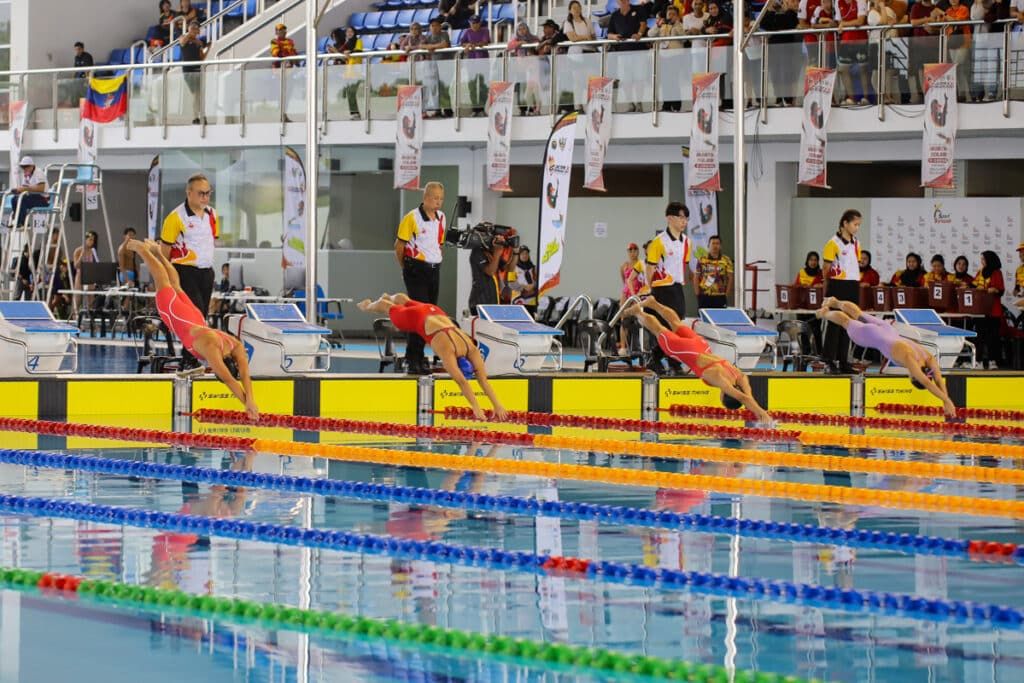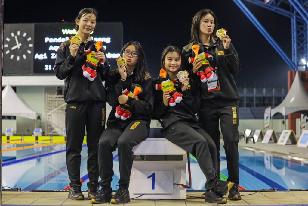 Atlet renang Selangor Lim Shun Qi (kanan), Morgan Eleven Teo Kai Cheng (kiri), Khew Zi Xian (dua kiri) dan Yoong Jia Jia (dua kanan) meraikan kemenangan pingat emas dalam acara 4 X100m gaya bebas wanita ketika Sukan Malaysia (SUKMA) 2024 di Pusat Akuatik Pandelela Rinong, Petra Jaya pada 21 Ogos 2024.