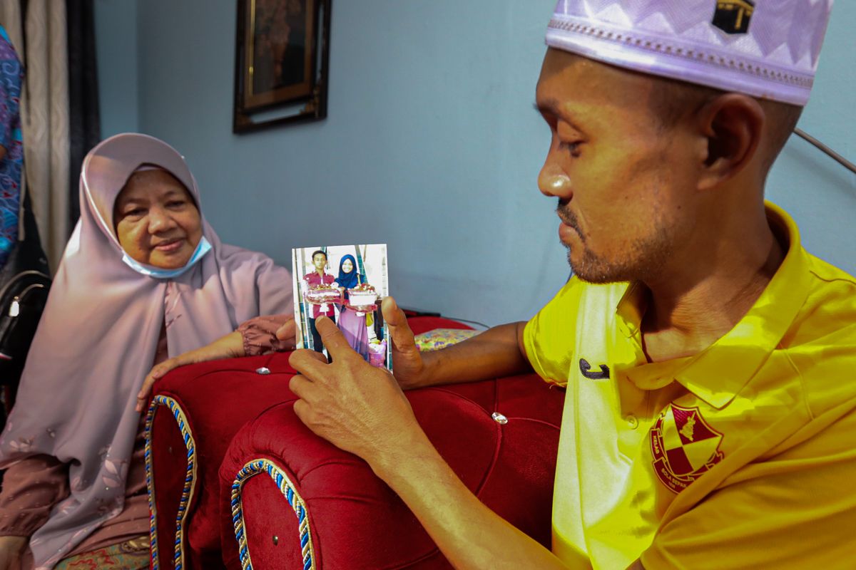 Ibu kepada Arwah pemain pasukan Selangor FC, Muhammad Husni Idrus, Apridah Mohd Arusman (kiri) bersama Anak sulungnya Mohammad Hidayat Idrus (kanan) menunjukkan gambar kenangan arwah ketika dikediaman mereka di Kampung Sungai Kertas, Gombak pada 31 Mei 2022.
