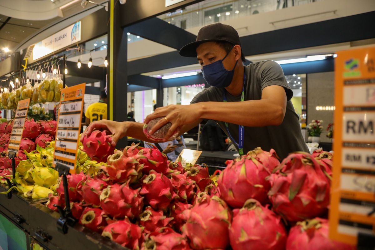 Peniaga, Leo Chen Lun, 39 sedang menyusun buah naga digerainya ketika program Jelajah Agro Selangor yang bermula dari 26 sehingga 29 di Central i-City, Shah Alam pada 27 Mei 2022.