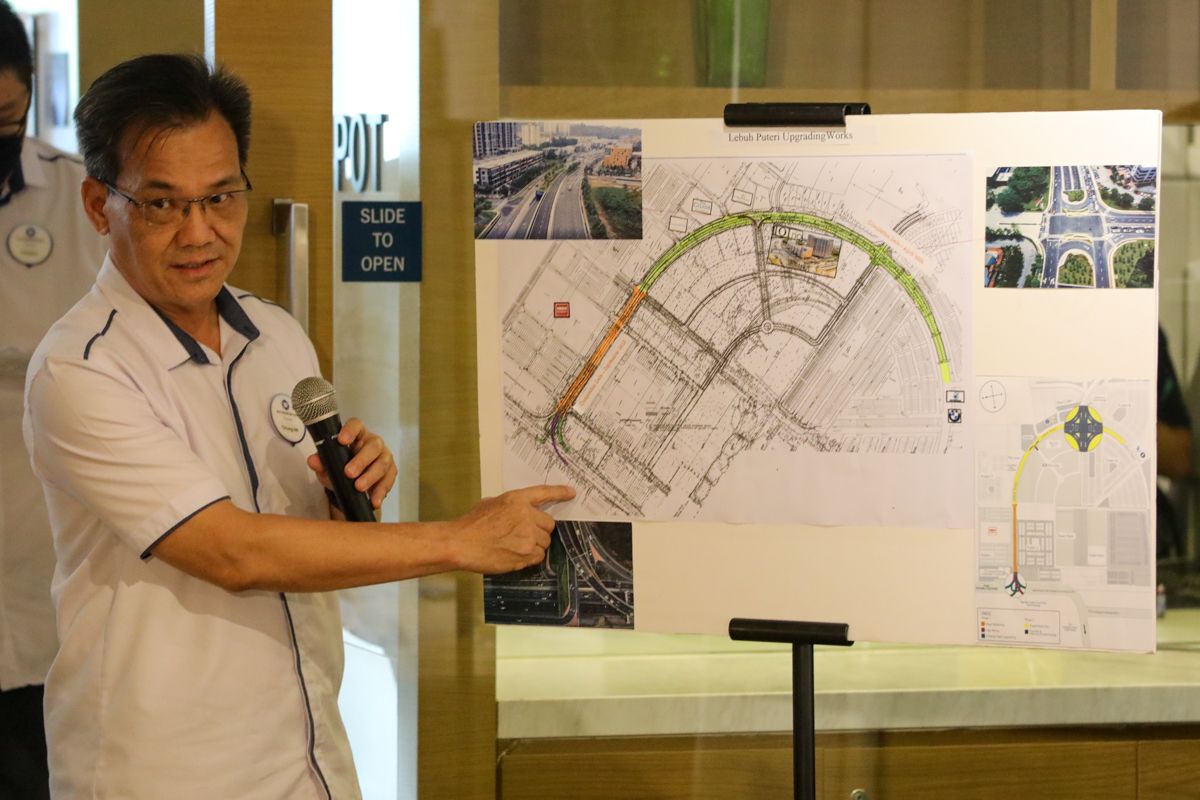 Pengurus Projek IOI Propeties, Chung Nyuk Kiong memberi penerangan berkaitan laluan pertukaran ketika sidang media selepas perasmian pembukaan laluan pertukaran Bandar Rio di Bandar Puteri Puchong, Subang Jaya pada 27 Mei 2022.