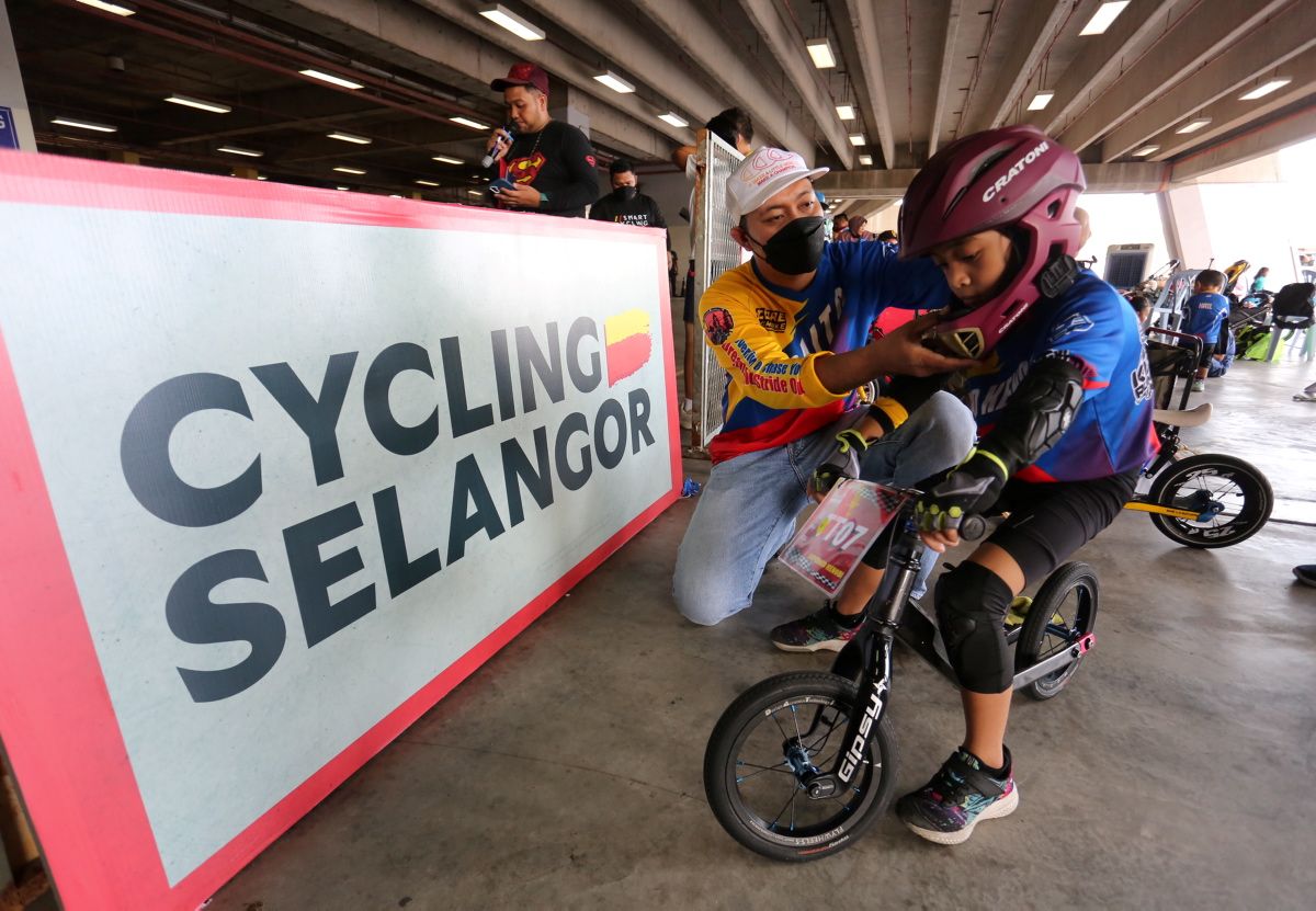 Ksaito Har Padil, 32, memakaikan topi keledar anaknya, Mikael Keno I La Harza, 6, sebelum bermulanya kejohanan basikal tolak dalam program Smart Cycling Fest 2022 dan perasmian kempen Smart Cycling di Stadium Shah Alam pada 29 Mei 2022.