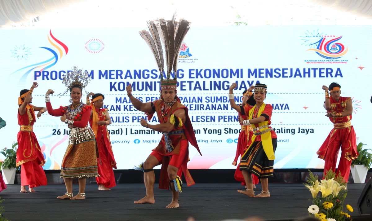 Artis kebudayaan Majlis Bandaraya Petaling Jaya (MBPJ) membuat persembahan pada program Merangsang Ekonomi Mensejahtera Komuniti Petaling Jaya di Laman MBPJ pada 26 Jun 2022.