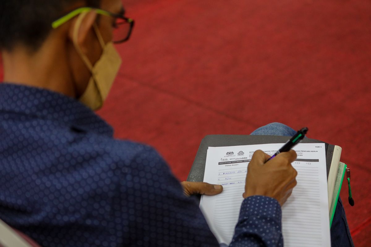 Peserta mengisi borang permohan pekerjaan sebelum di temu duga ketika program Jelajah JobCare di Dewan Utama Demesne, Hulu Langat pada 21 Mei 2022.