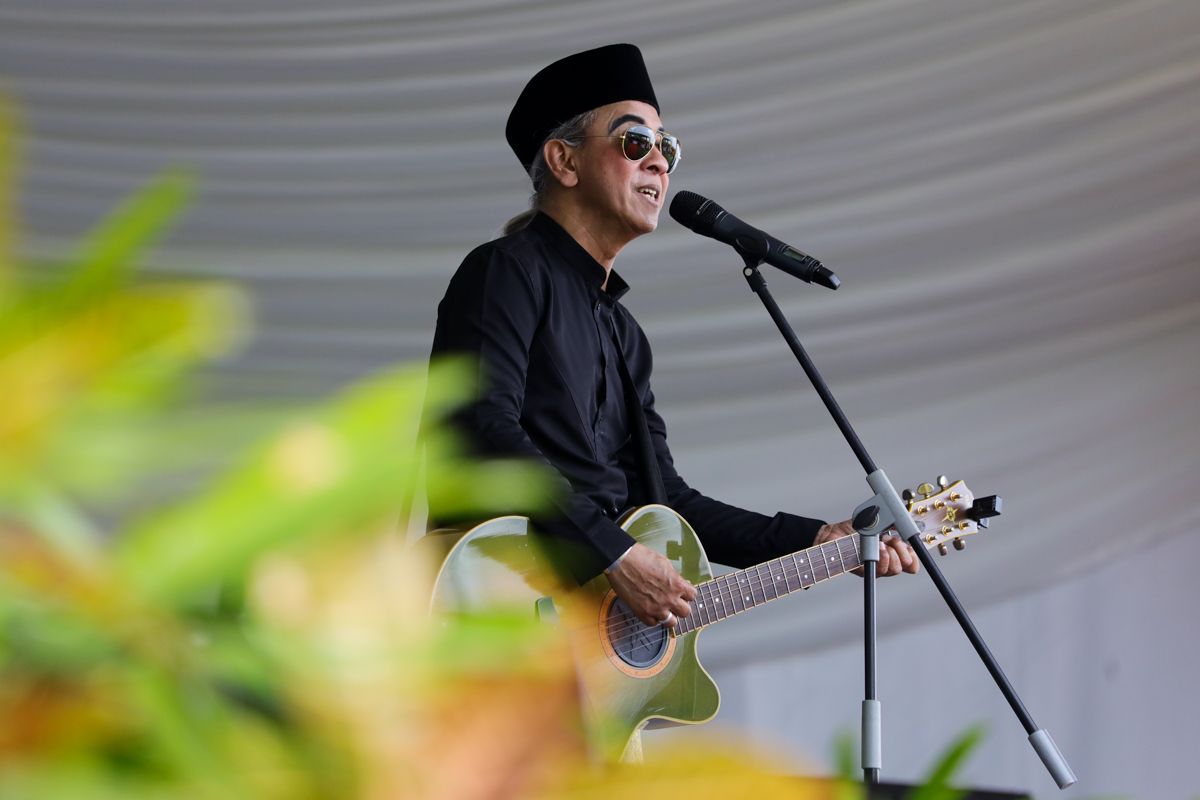 Yang Dipertua Majlis Perbandaran Kuala Langat Dato' Amirul Azizan Abdul Rahim menghiburkan tetamu dengan dalam Majlis Rumah Terbuka Negeri Selangor Peringkat Daerah Kuala Langat di perkarangan Stadium Jugra, Banting pada 19 Mei 2022.