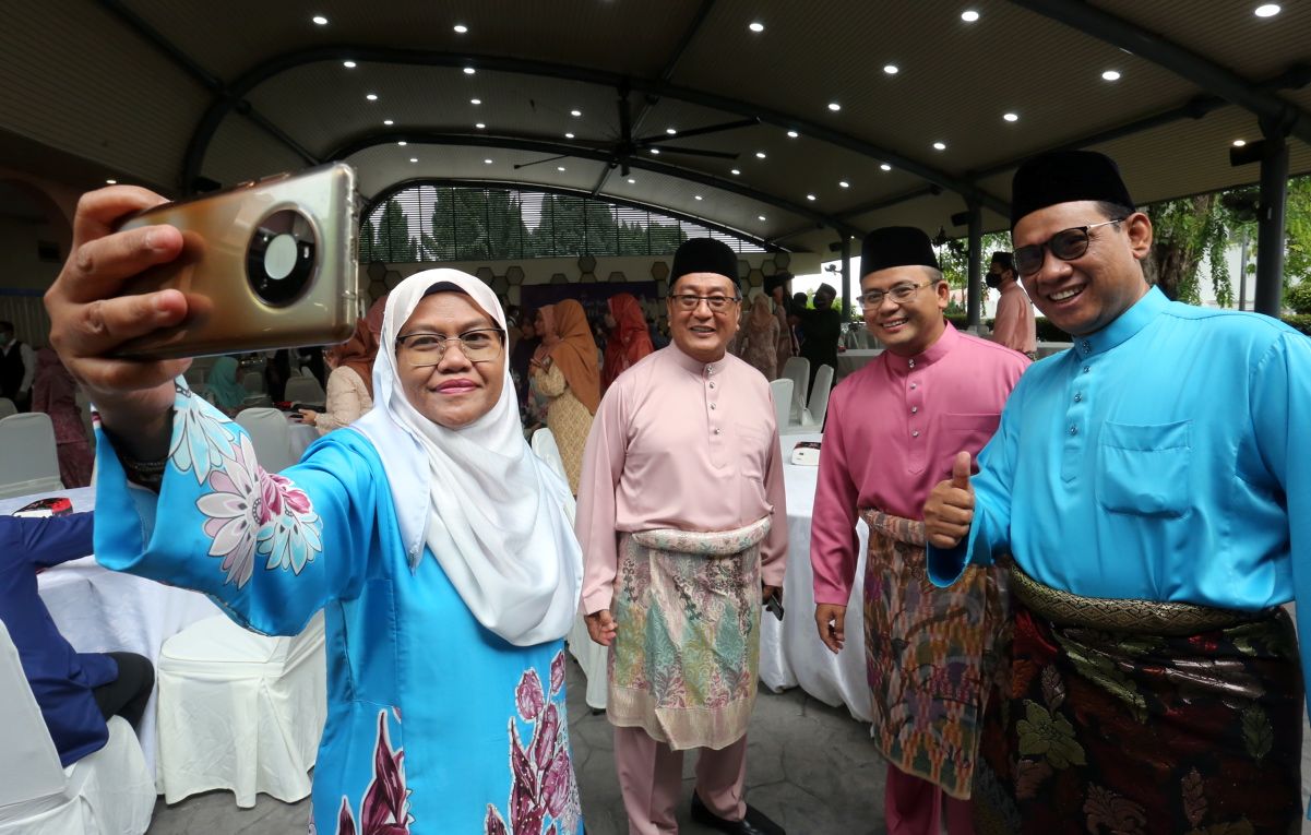 Ahli Dewan Negeri (ADN) Permatang Rozana Zainal Abidin berswafoto bersama Dato' Menteri Besar Dato' Seri Amirudin Shari dan Setiausaha Kerajaan Negeri Dato' Haris Kasim (dua, kiri) dalam Majlis Jamuan Hari Raya Aidilfitri di Kediaman Rasmi Dato' Menteri Besar, Seksyen 7, Shah Alam pada 3 Mei 2022.