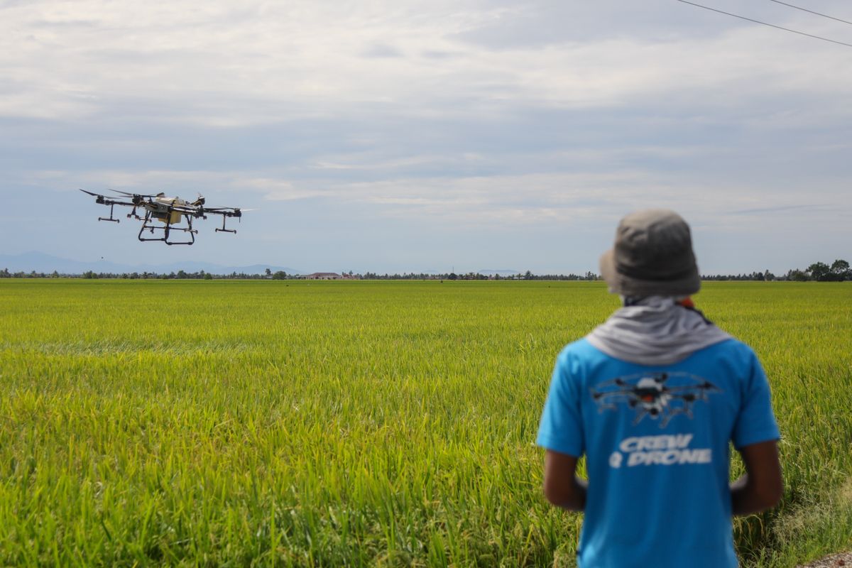 Pengemudi dron semburan racun RNB Global Resources, Mohd Nor Iqbal Mohd Rafee, sedang mengemudi dron bagi menyembur racun pada sawah padi ketika tinjauan Media Selangor di Seckinchan, Sabak Bernam pada 11 Mei 2022.