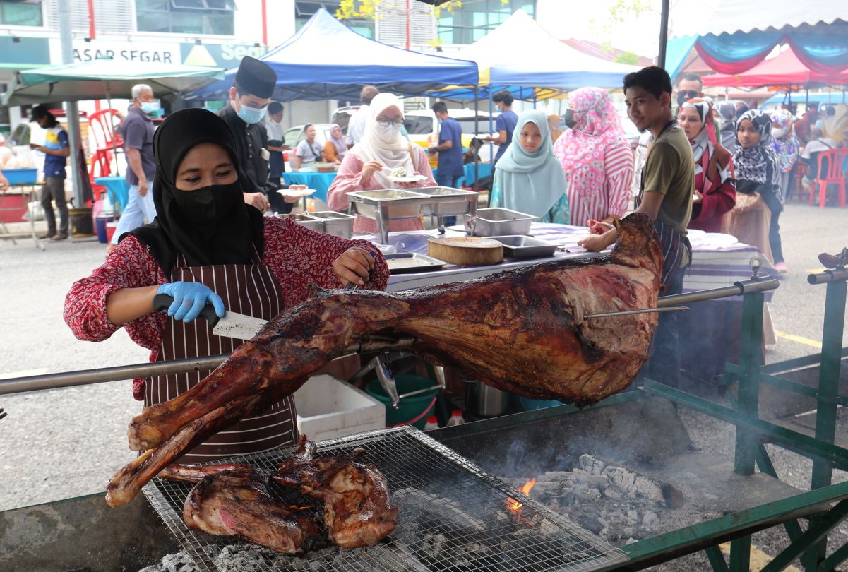 Zalizan Marsid, 53, melapah kambing bakar untuk diberikan sebagai hidangan kepada para tetamu di Majlis Rumah Terbuka Aidilfitri di perkarangan Pusat Khidmat Masyarakat DUN Bukit Melawati, Kuala Selangor pada 15 Mei 2022.