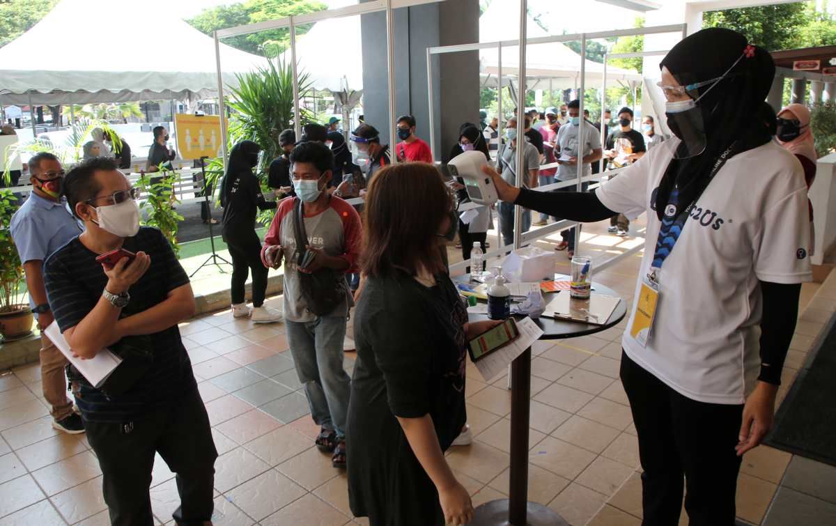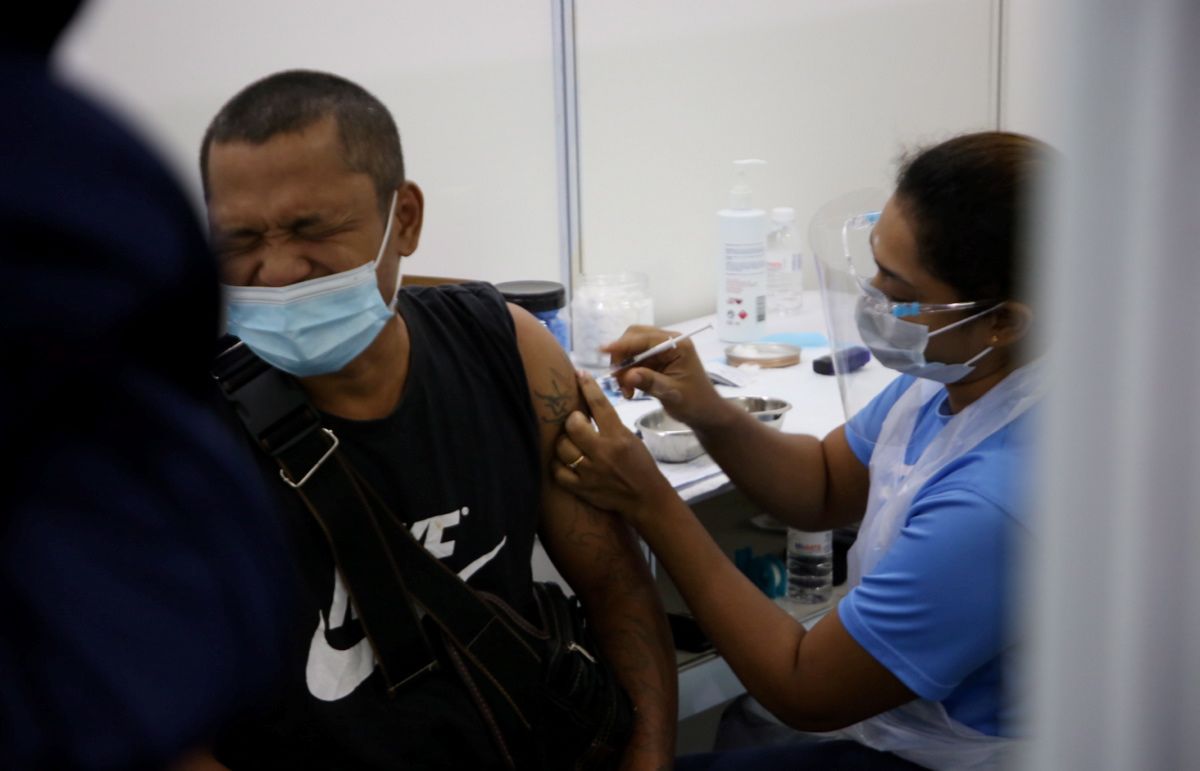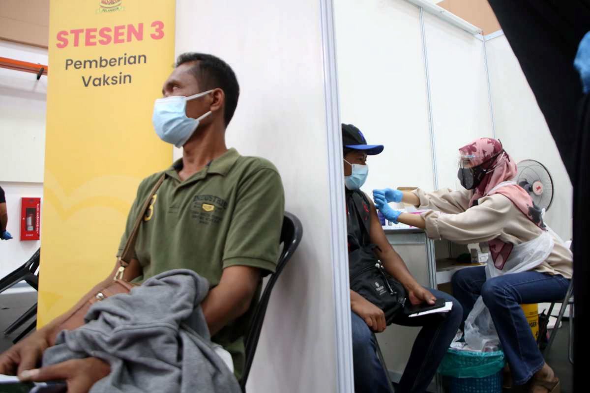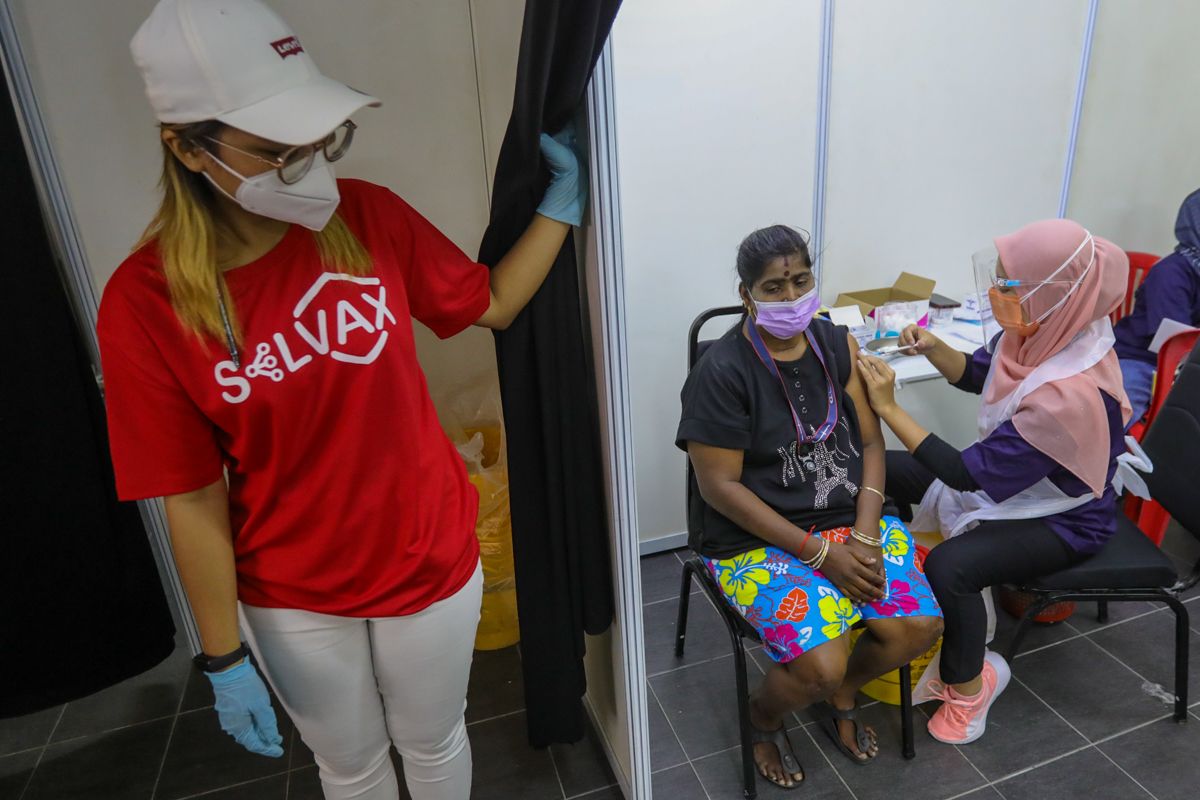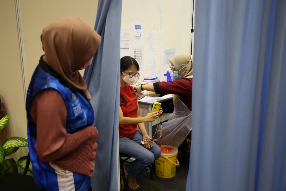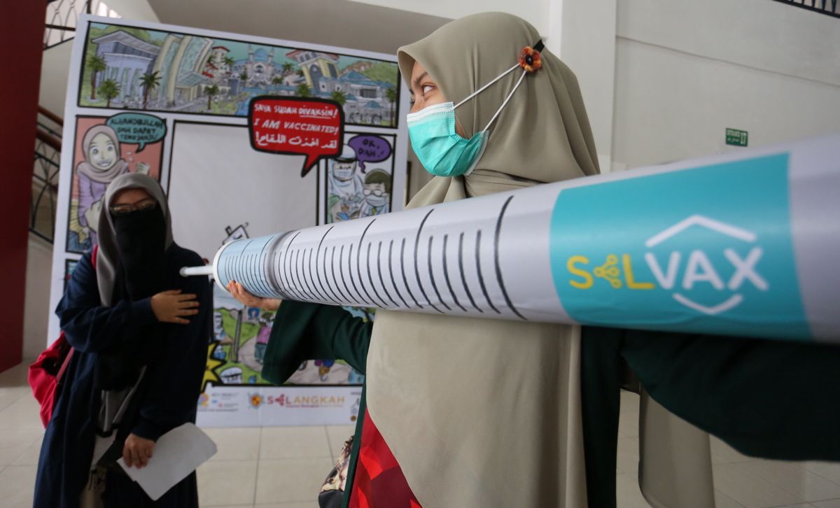 Pelajar jurusan Quran Sunnah Universiti Islam Antarabangsa Malaysia (UIAM), Wardahtul Nazierah Mohd Aziz, 20 (kanan) dan rakannya Nurul Sorfina Mohd Halim Mahadi, 20, bergambar bersama replika jarum selepas menerima suntikan vaksin Covid-19 dalam Program Vaksin Selangor (Selvax) di Pusat Pemberian Vaksin (PPV) UIAM, Gombak pada 18 Ogos 2021.