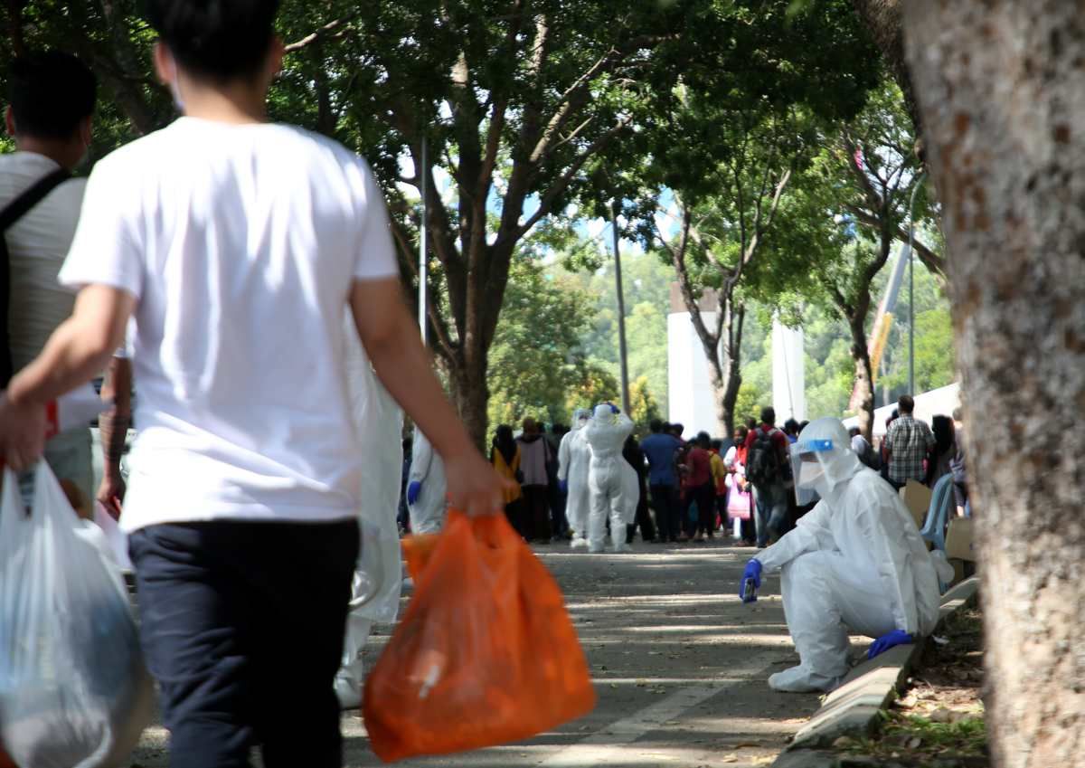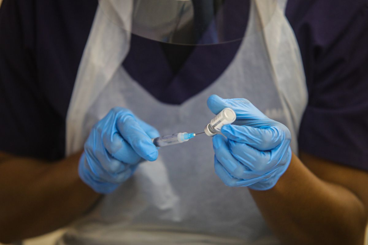 Petugas kesihatan, memasukkan cecair vaksin COVID-19 jenis Sinovac ke dalam picagari sebelum memberi suntikan kepada penerima ketika Program Vaksin Selangor (Selvax) Komuniti DUN Bukit Melawati di Dewan MDKS, Bandar Baru, Kuala Selangor pada 1 Ogos 2021.