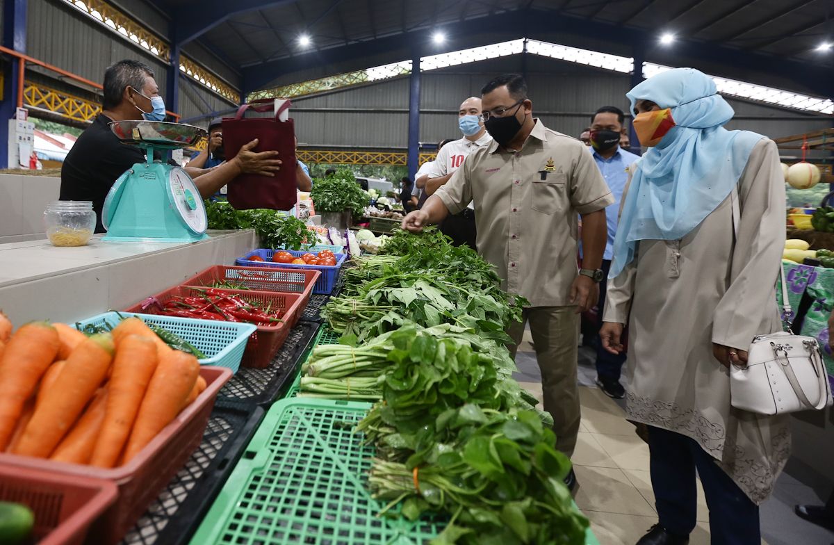 Dato' Menteri Besar Selangor, Dato' Seri Amirudin Shari (tengah) bersama Isteri Datin Masdiana Muhamad (kanan) beramah mesra bersama peniaga dan mengedarkan kit cecair pembasmi kuman di Pasar Awam Banting, Kuala Langat pada 21 Mac 2021.