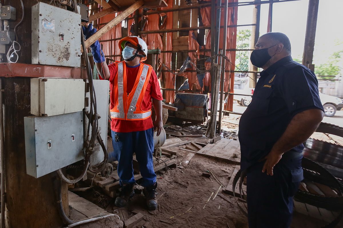 Kakitangan Tenaga Nasional Berhad (TNB) bersama Penguat kuasa, Pejabat Daerah dan Tanah Klang membuat pemeriksaan sebelum membuat pemotongan bekalan elektrik di Jalan Jeti, Pelabuhan Klang pada 11 Mac 2021.