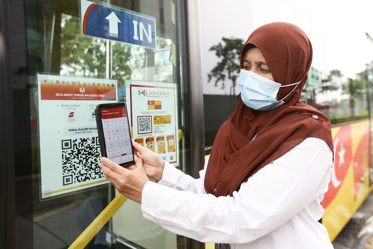 Ketua Depot Bas Smart Selangor, Ruslina Kamaruddin, mengimbas aplikasi Scan To Ride sebelum menaiki bas smart Selangor ketika Majlis Pelancaran Aplikasi Scan To Ride di Menara Bank Simpanan Nasional, Shah Alam pada 1 Mac 2021.