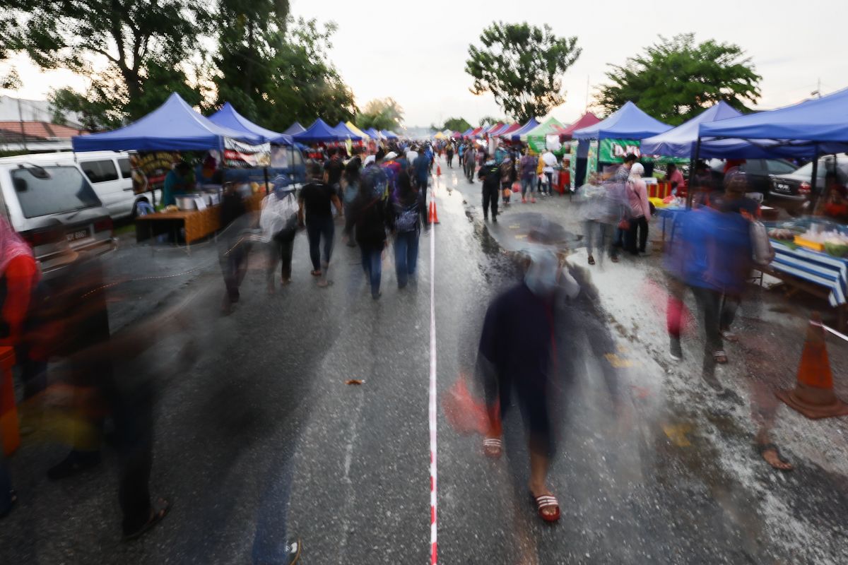 Suasana peniaga dan pengunjung di bazar ramadan ketika tinjauan di Bazar Ramadan Taman Delima, Kajang pada 13 April 2021.Kerajaan membenarkan bazaar ramadan beroperasi pada tahun ini dengan mengikut Tatacara Operasi Piawai (SOP) yang telah ditetapkan bagi mengawal penularan Covid-19.