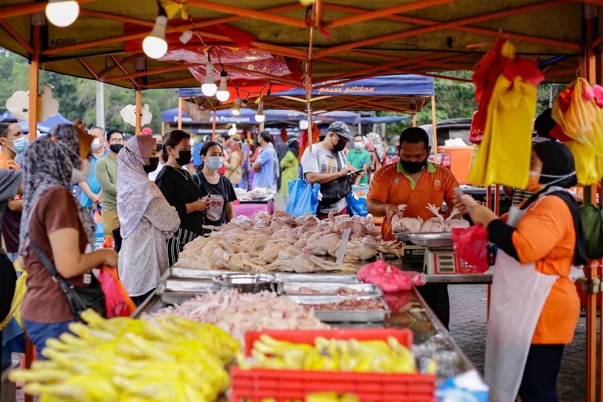 Pengunjung mengikut Tatacara Operasi Piawai (SOP) memakai pelitup muka serta menjaga jarak sosial ketika membeli ayam bagi persiapan raya di Pasar tani @Khas Aidilfitri, Perkarangan Stadium Shah Alam pada 9 Mei 2021.