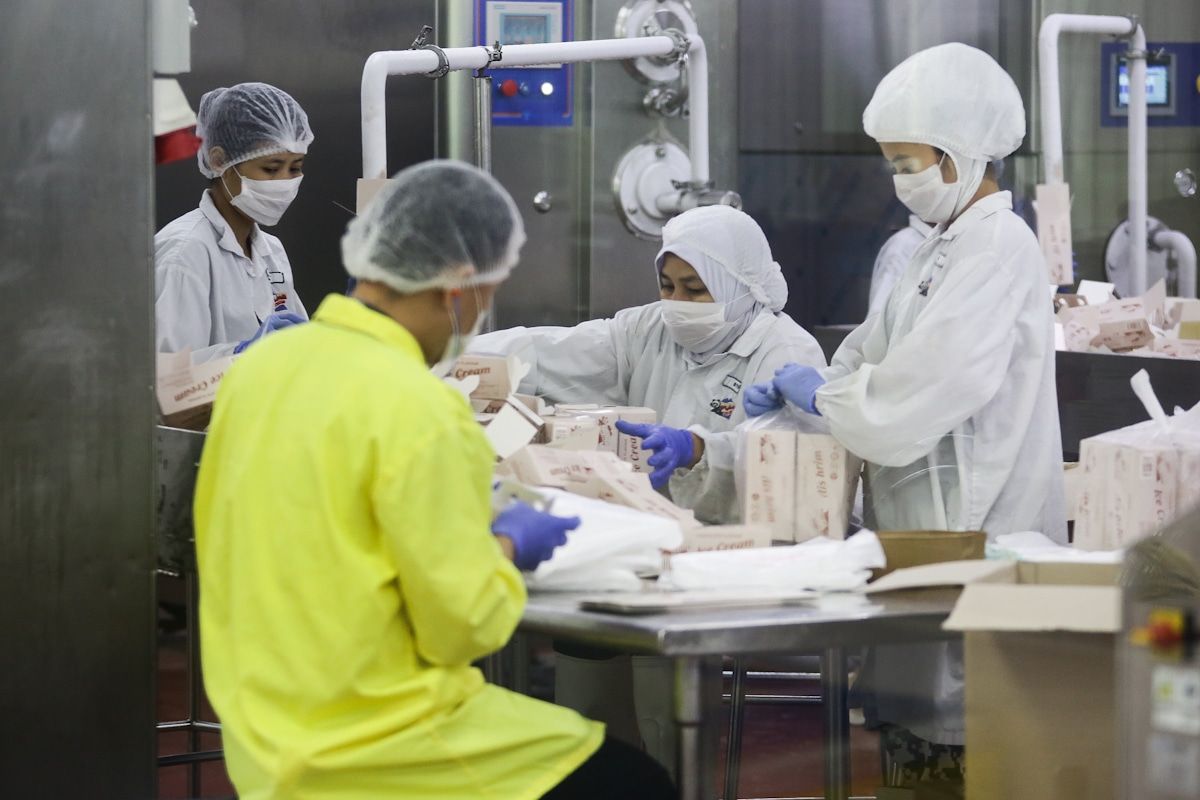 Pekerja sedang melakukan proses membungkus aiskrim di Kilang Polar Ice Cream Sdn Bhd di Perindustrian Cheras Jaya, Balakong pada 22 Jun 2020.