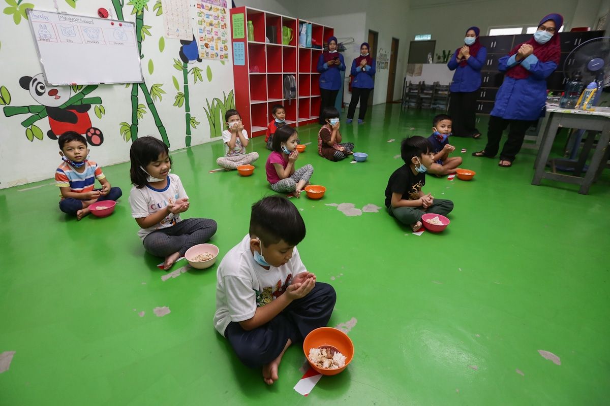 Kanak - kanak asuhan membaca doa makan bersama guru dengan mematuhi Tatacara Operasi Piawai (SOP) jarak sosial di Pusat Jagaan Didik Cemerlang Jalan Kebun, Shah Alam pada 18 Jun 2020.