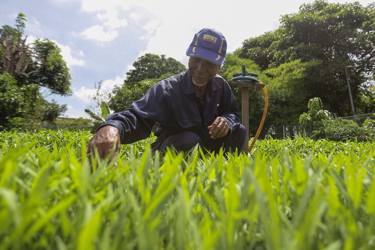 Pekerja pembersihan sedang melakukan kerja-kerja memotong rumput di Gamuda Discovery Park, Dengkil pada 28 Jun 2020.